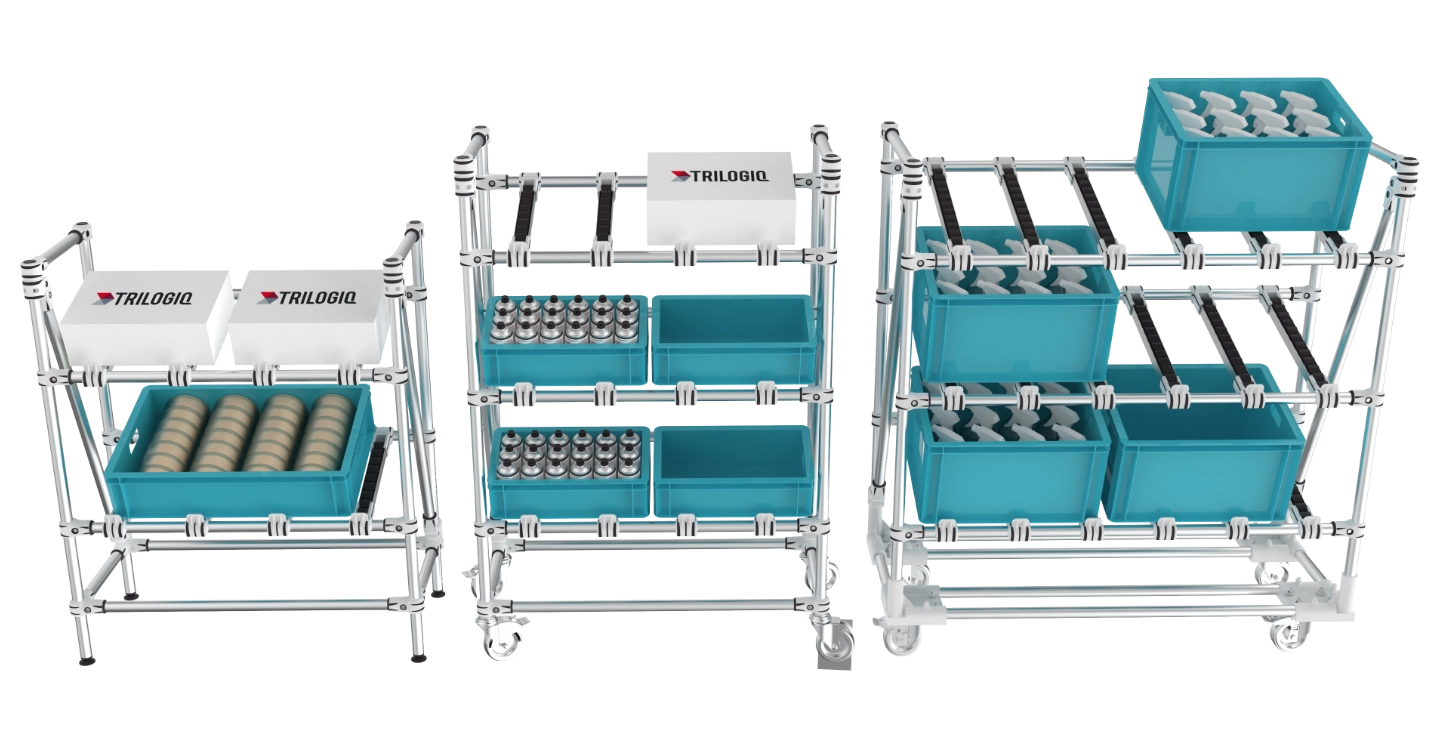 FIFO dynamic shelves with roller tracks and adjustable inclined trays. Front stop. Swivel tube casters with brakes for regular or intensive movement. Lightweight and mobile aluminum structure. Ideal for plastic bins, cartons, and KLT. Load capacity: 100 kg per level. Configurable in equipment and dimensions using the online simulator.